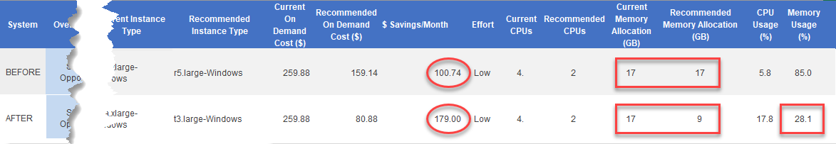 The second row shows a recommendation that was generated using actual, collected memory data. Densify identified $179 in monthly savings. The number of cores as well as the amount of required memory is decreased, based on the actual data showing that less memory is needed for the workload. Even with the decreased memory allocation, the memory utilization (%) decreases to almost 28%.