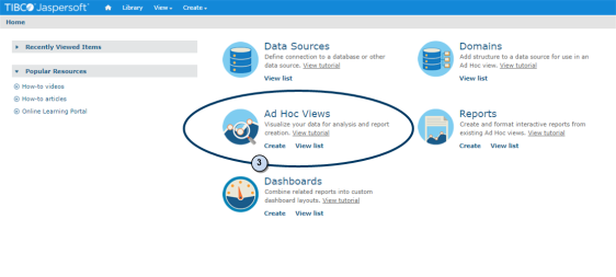 - In the JasperReports Server console, select Ad Hoc Views > Create. Alternately, click the toolbar Create > Ad Hoc Views.