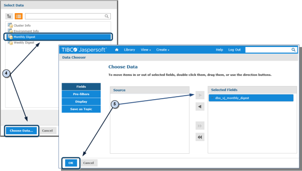 - In the Choose Data window, select one or more views from the Source list and add them to Selected Fields list. Click OK.