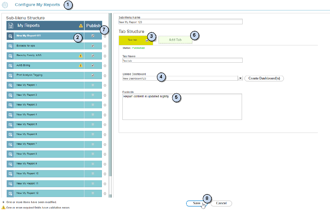 - Select an empty New My Report # report tab from the Sub-Menu Structure. Enter a name for your report in the Sub-Menu Name field. This name is then displayed on the selected report tab in the Sub-Menu Structure.