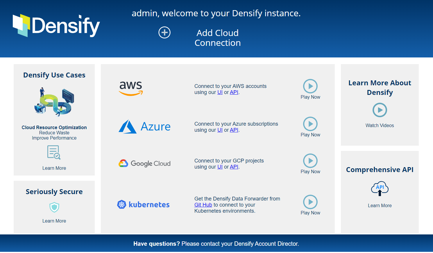 When you first log into your Densify instance, you will see the landing page with the option to add connections via the Public Cloud Connections wizard. Use the wizard to collect your infrastructure configuration, workload data and load it into Densify for analysis.