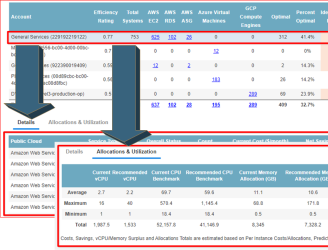 The breakdown of the data for your aggregated cloud environment is displayed on this tab. You can control how the data is displayed in this table using the Group By feature. The Group By setting is used in the first column and data is retrieved and displayed accordingly.