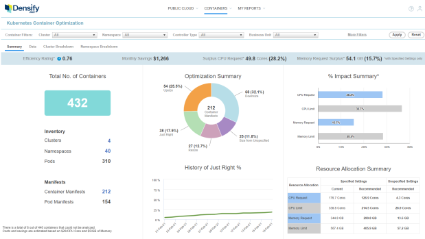 The summary overview provides a number of charts and tables to show you potential savings in your container environments.