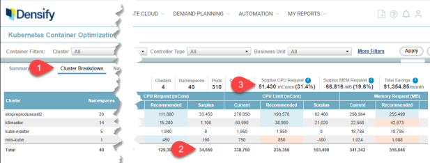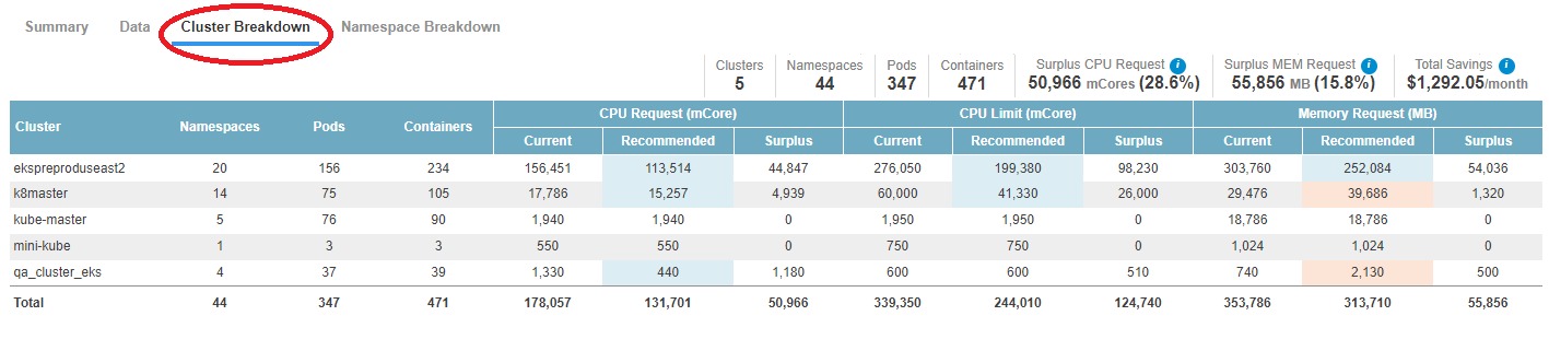 - Cluster Breakdown—Provides a breakdown by cluster showing current and recommended requests and limits for both CPU and memory.
