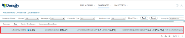 Another Cluster Breakdown tab is shown on the Data tab. The set of data is similar but allows you to view only the subset of data selected on the main part of the Data tab. See Optimizing Your Containers - Data Tab.