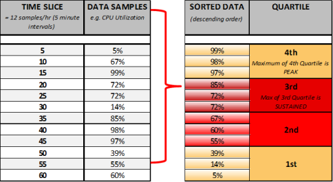 • The 12 values are then re-ordered in descending order and separated into equal sample sizes (quartiles), with each quartile having three values. Each quartile represents 25% of operational time.