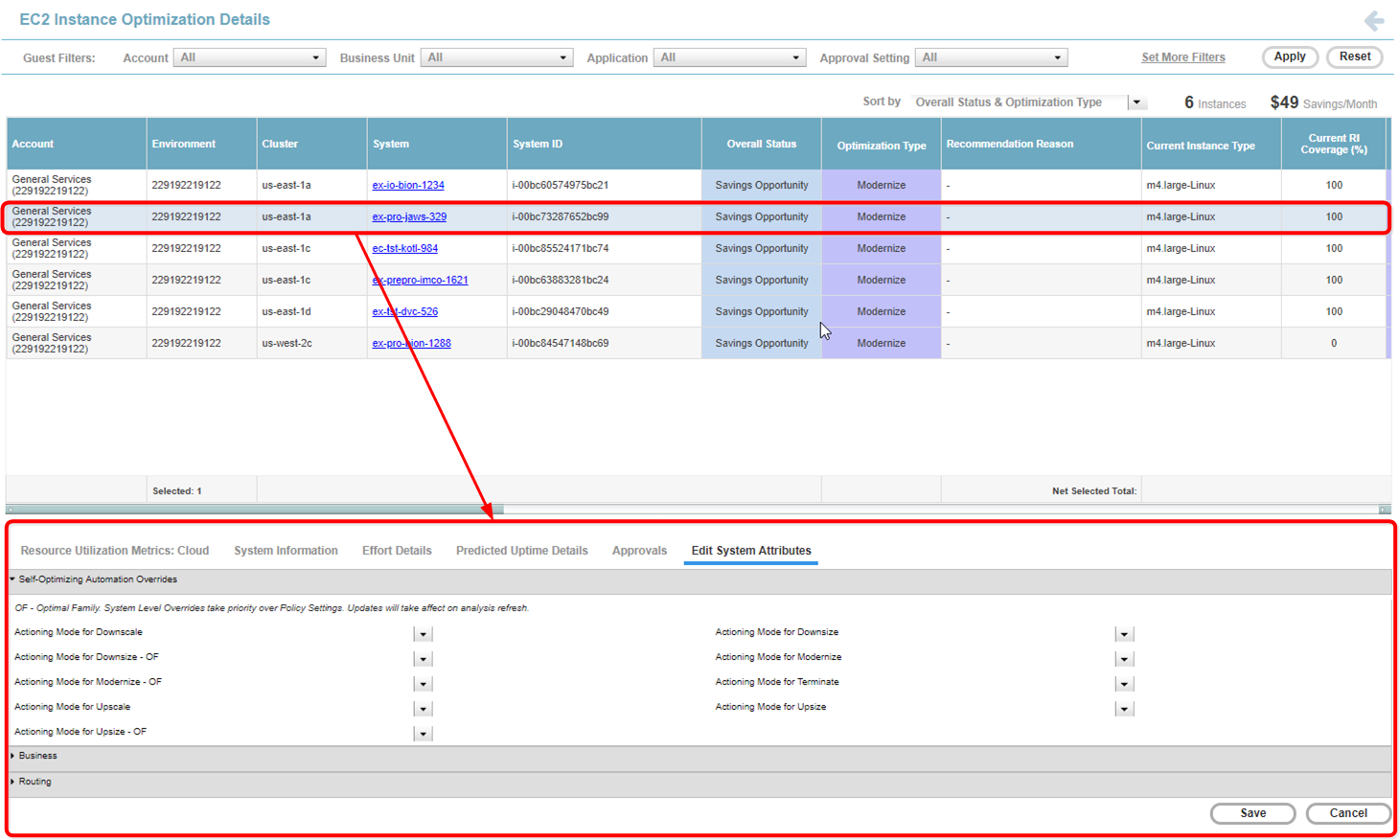• A lower pane with system details—Based on the selected system in the tabular top pane, various details and settings for the system are available in separate tabs, such as system resource utilization charts, system details, optimization approvals and modifying system attributes. See Reviewing Specific Instance Details for details on each tab.