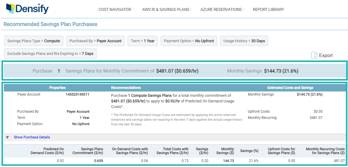 These recommendations are based on the report settings on the left side of the page. See Savings Plan Settings for details.