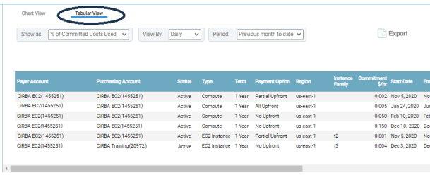 The tabular report allows you to view the detailed data. The table is sorted on the % Utilization and both used and unused costs are displayed so you can view and compare how the individual savings plans are being used.