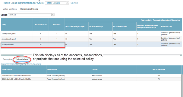 - Accounts/Subscriptions/Projects—This tab displays all of the accounts, subscriptions, or projects that are using one of the policies.