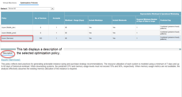 - Optimization Policies—Displays the cloud policies and their settings. This tab is similar to the top pane of the Optimization Policies page with "Show All" selected in the policy category filter.